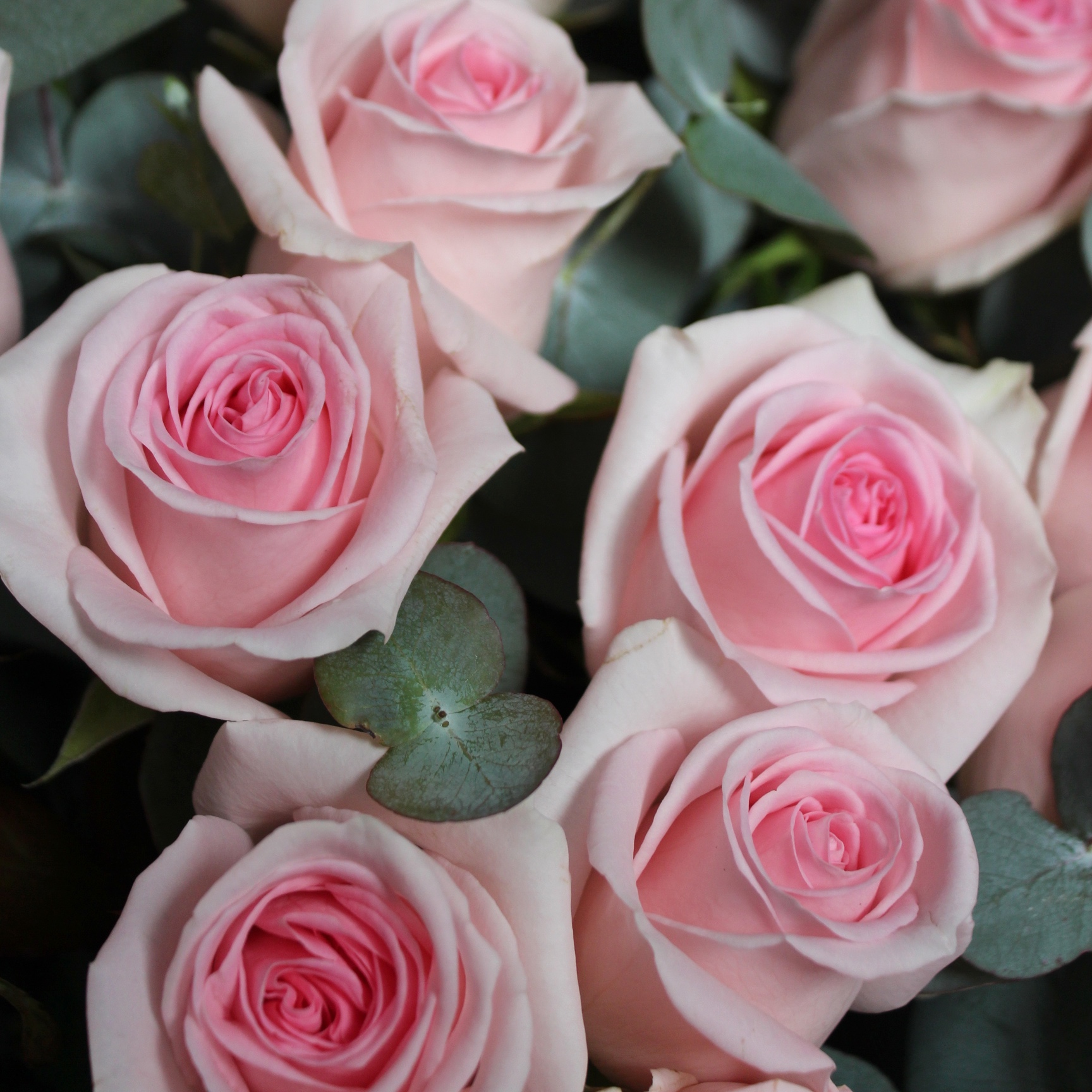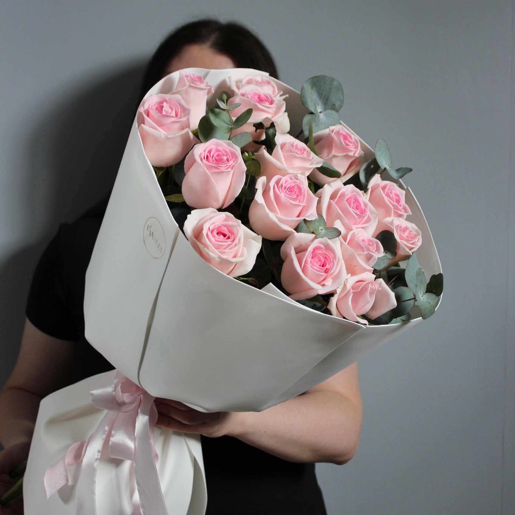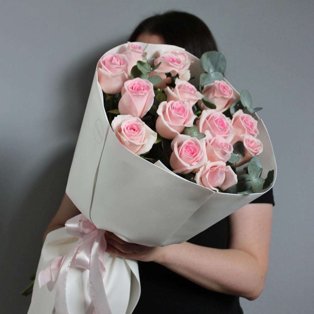 Букет из 15 розовых с эвкалиптом