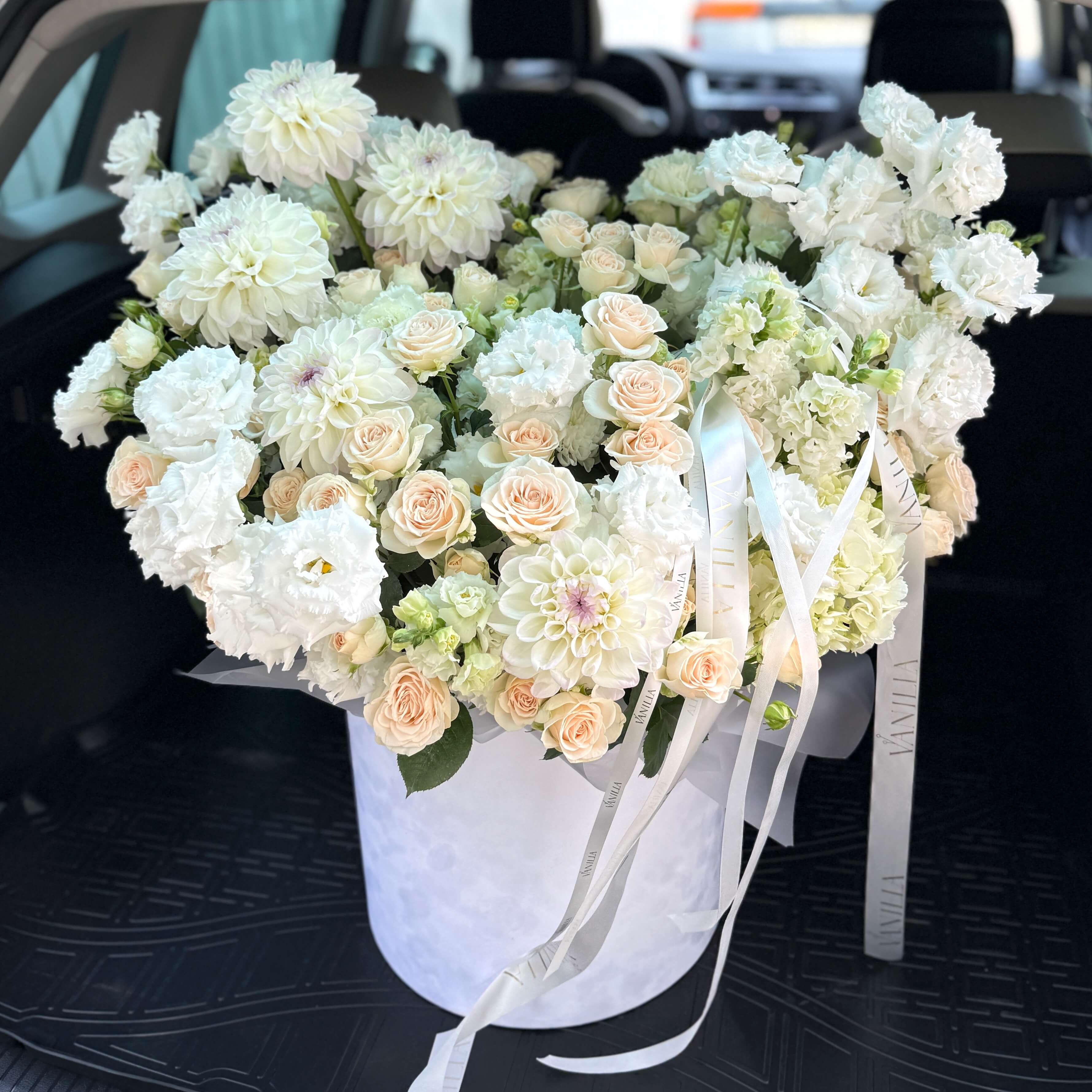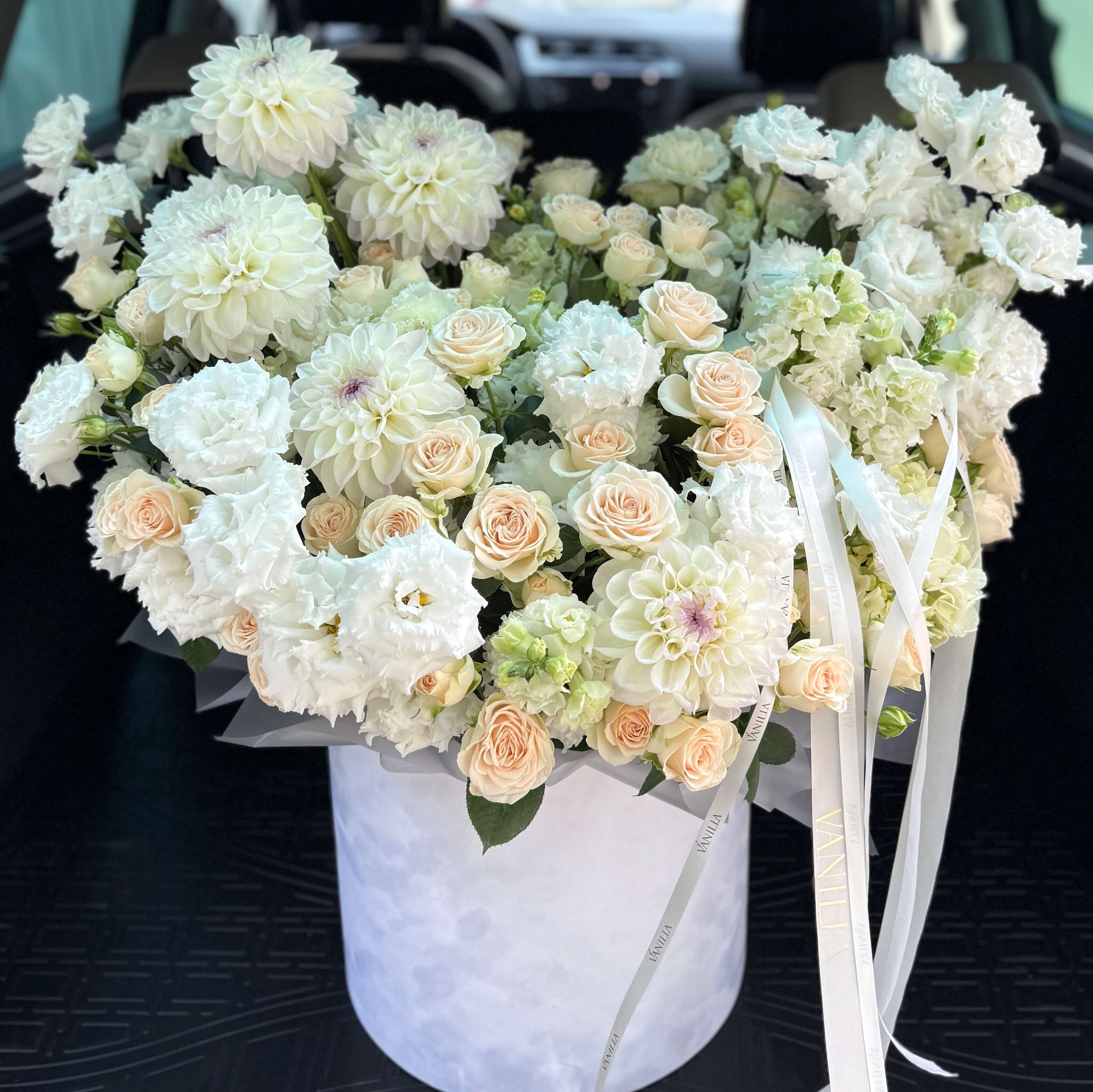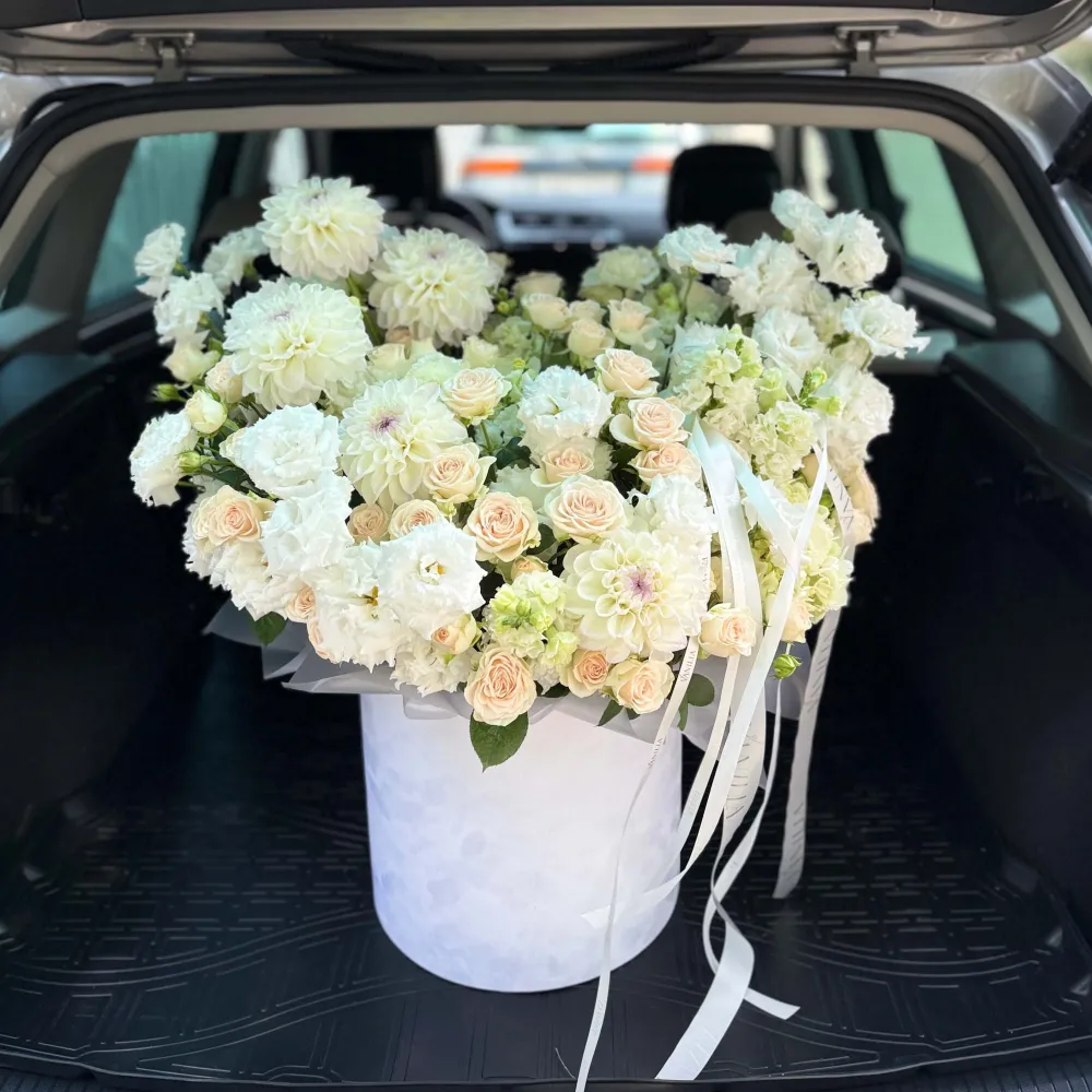 Ароматная, элегантная и утонченная композиция, станет отличным подарком на любой тип мероприятия. Чтобы получить нежнейший букет мы взяли 20 кустовых роз, затем к ним присоединили 20 веток белой эустомы, чтобы букет получился еще более нежным добавили георгины, хризантему, львиный зев, гортензию.
