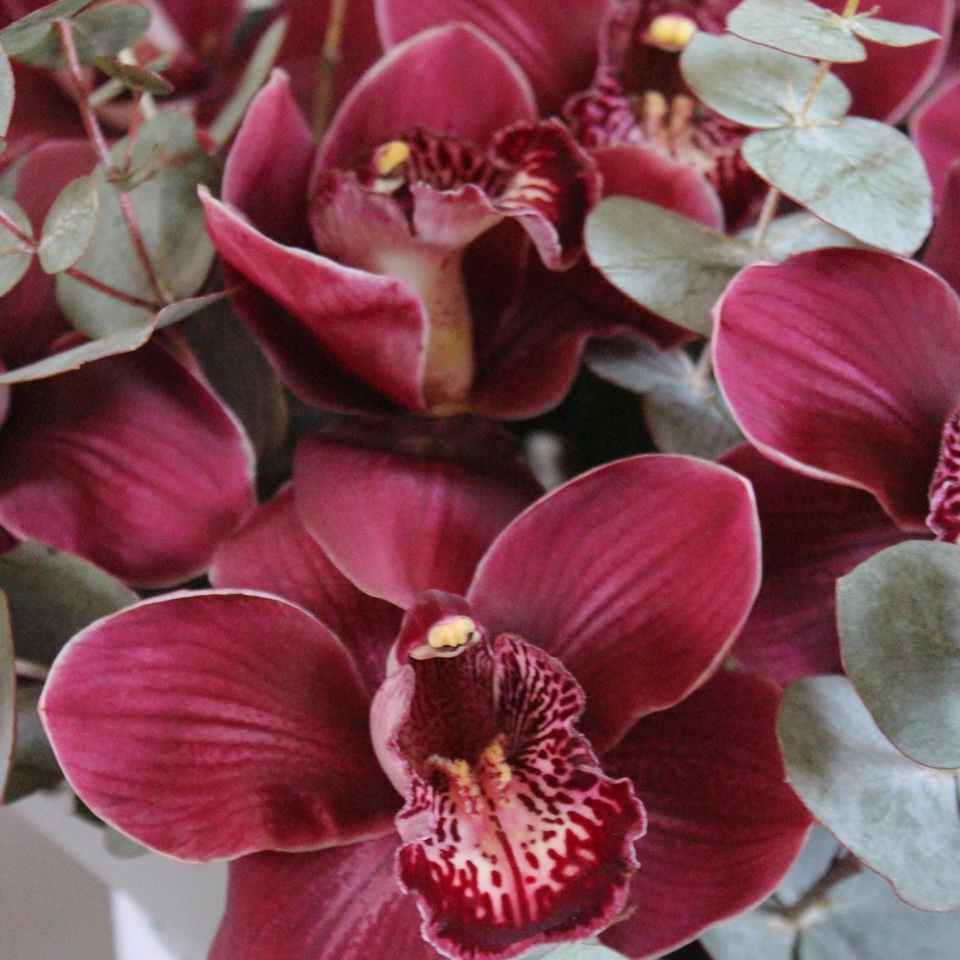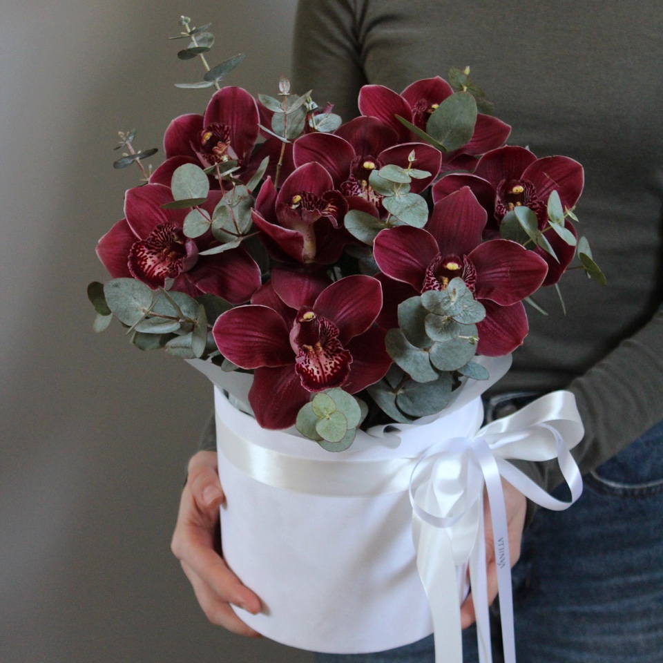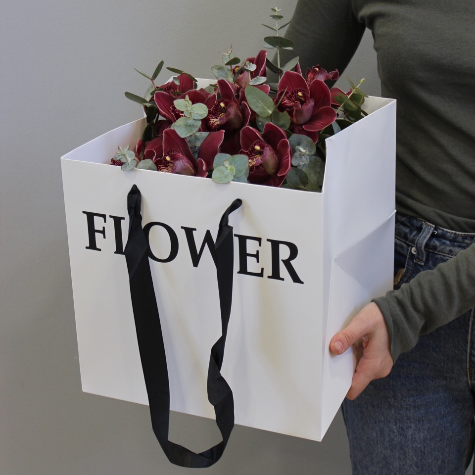 - орхидея - 9 шт зелень - писташ/эвкалипт бокс черный 16 d, губка флористическая - 1 шт лента атласная - 2 шт, пленка матовая - 2 шт конверт - 1 шт, открытка - 1 шт инструкция по уходу за композицией - 1 шт пакет транспортировочный.