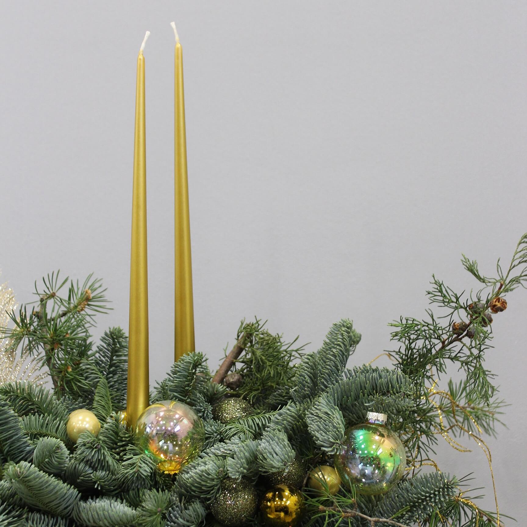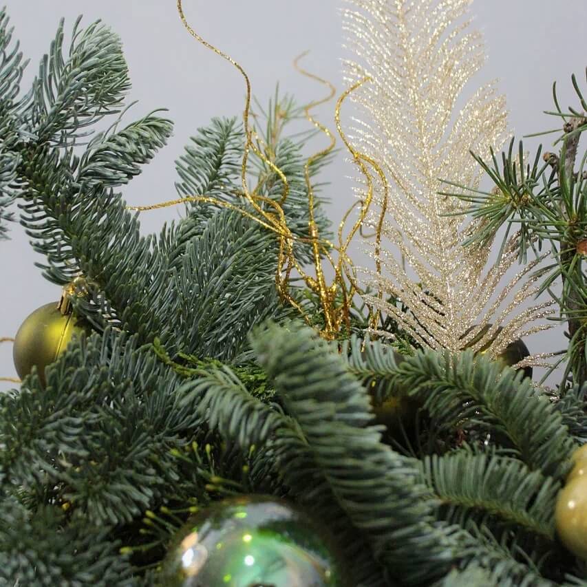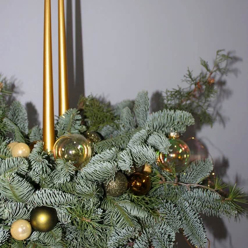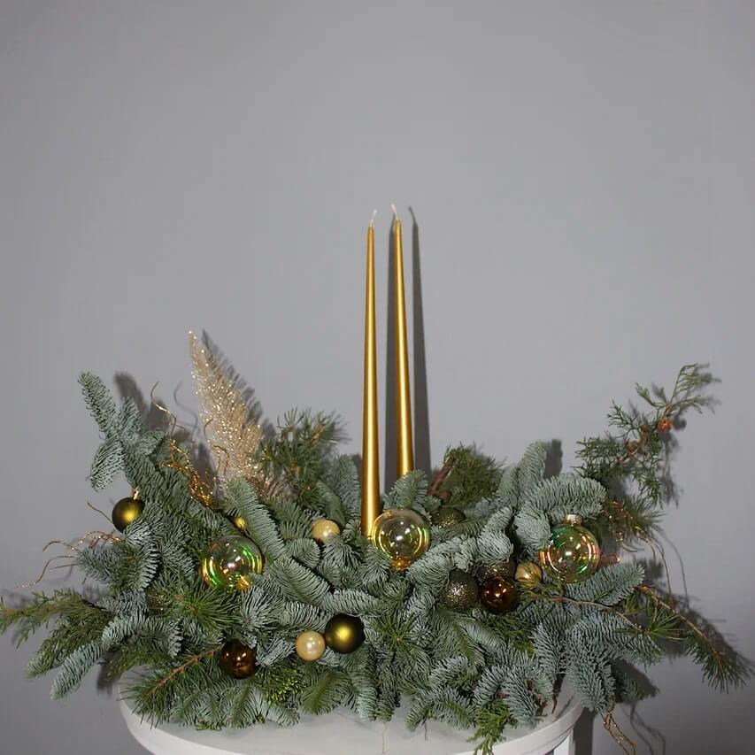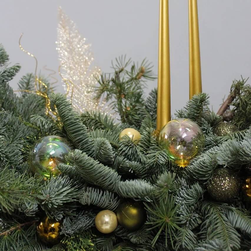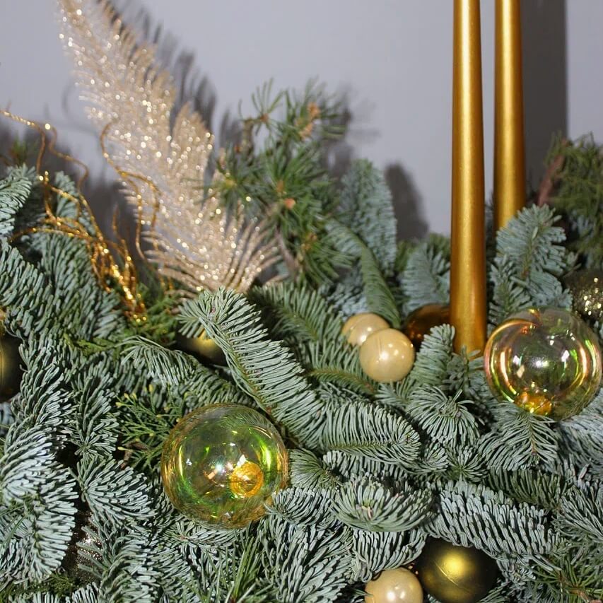 Новогодняя композиция из благородного нобилиса с декоративными свечами и ёлочными игрушками. Плотная хвойная основа создаёт объёмный, насыщенный силуэт, а аксессуары добавляют праздничное настроение.
