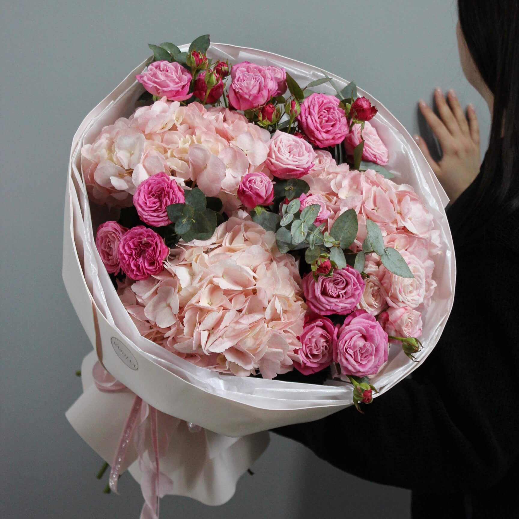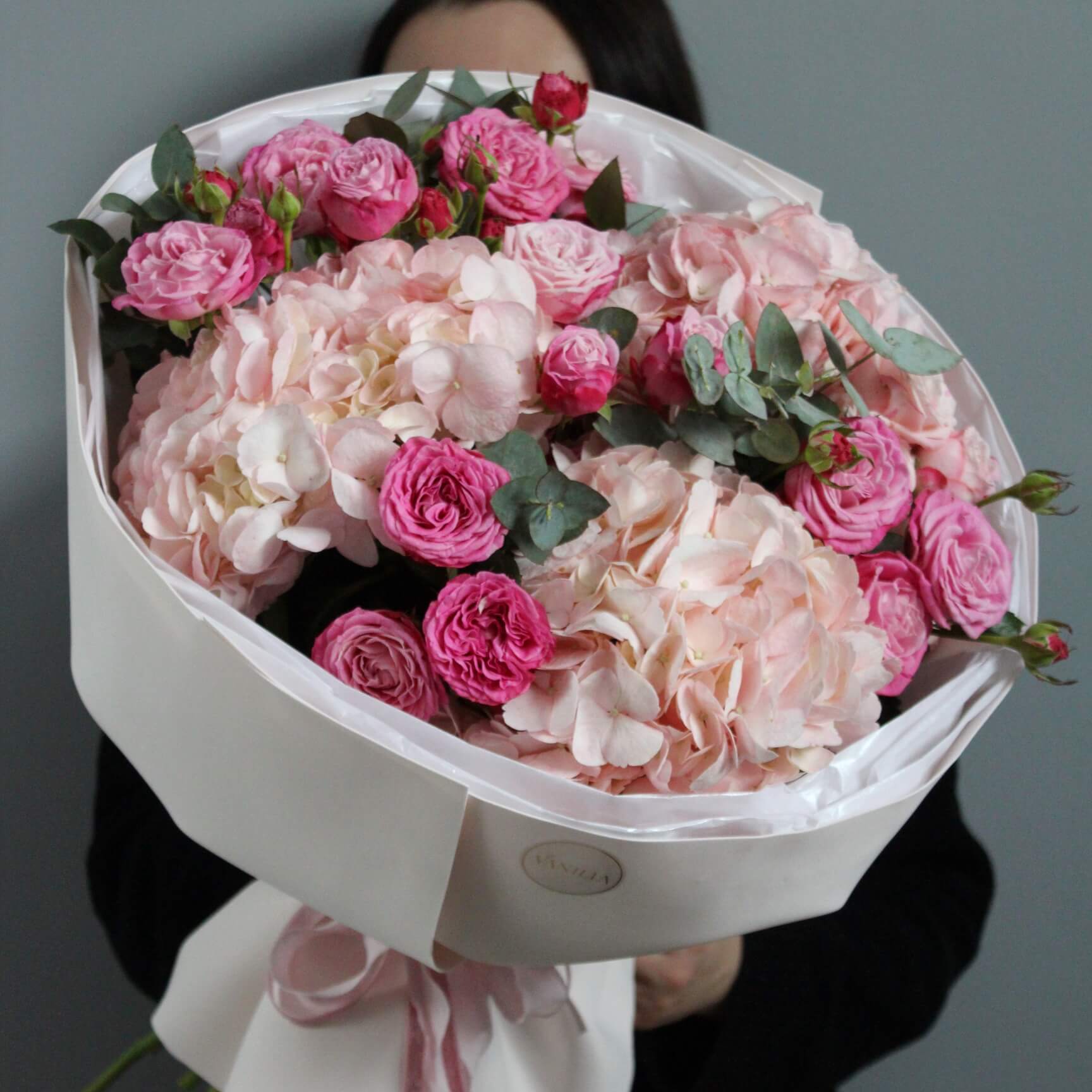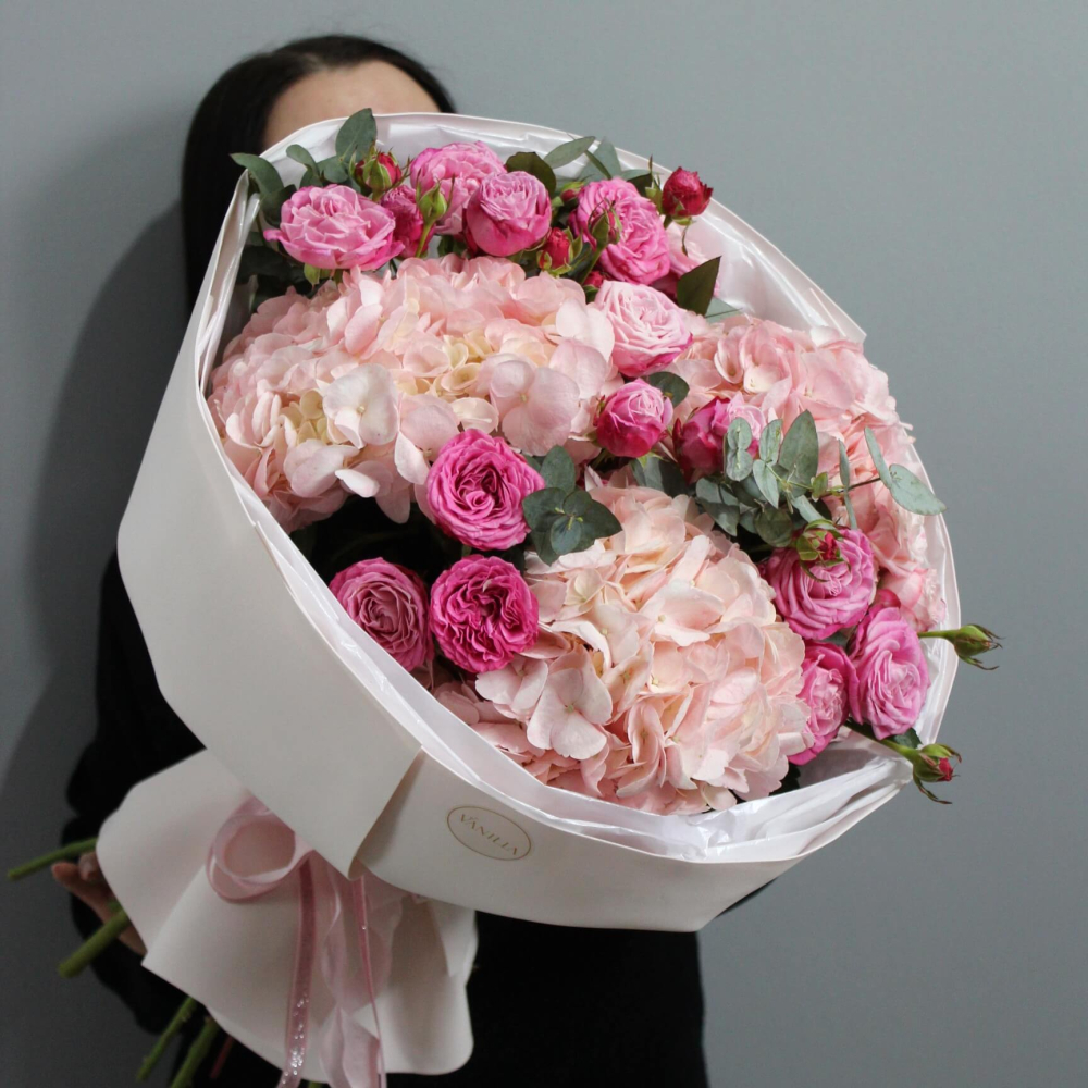 Яркие розы в сочетании с гортензией и эвкалиптом - прекрасный вариант для любого повода!