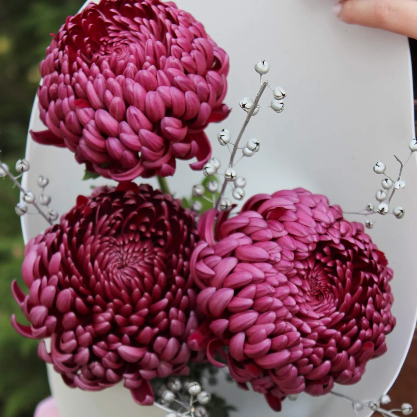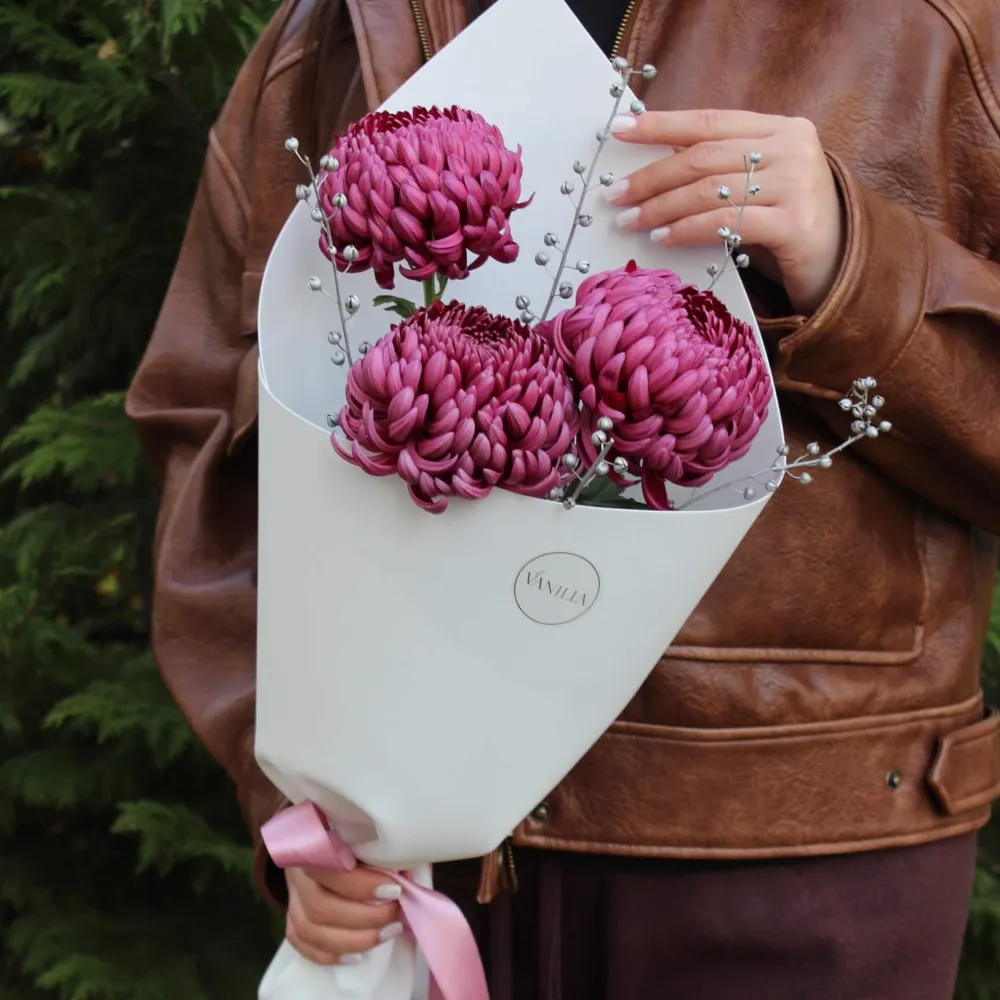 Лаконичная композиция с характером: три пышные хризантемы сорта «Бигуди» в насыщенном винном оттенке. Такой букет говорит без лишних слов — стильно, сдержанно, со вкусом.